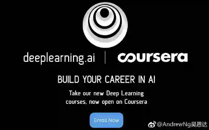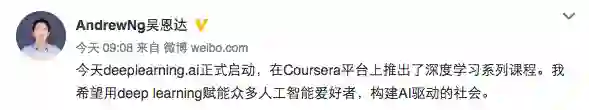 今天早上9点,吴恩达在微博发布消息,正式宣布deeplearning.ai项目启动,这是一个深度学习课程培训项目,这次吴老师(斯坦福副教授)可是干回”本质工作“,希望为coursera上的百万机器学习用户提供教学课程。感兴趣的同学可以去coursera报名,不过目前该课程是全英文的,对国内同学可能有些挑战;就吴恩达在国内影响力,如果中文版出来,应该在国内会很受欢迎。
