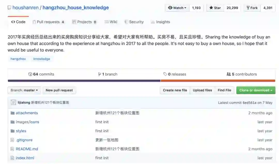 2018 年 3 月,GitHub Trending 上出现了一个十分硬核的项目,该项目的 Star、Fork 数增长迅速,目前已获得超过 2 万个 star。这个项目,总结了该作者 2017 年的买房经验,把杭州地区买房需要知道的那些大大小小的信息分门别类地做了整理,选择了以开源的方式帮助那些准备买房的人们。