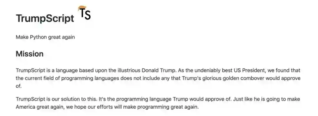 TrumpScript 是一种伪编程语言,由莱斯大学的四名学生在 36 小时的黑客马拉松上创建。TrumpScript 似乎确实是一种功能完备 (尽管有限) 的编程语言,由大约 1000 行代码组成的。以下是它的一些功能: