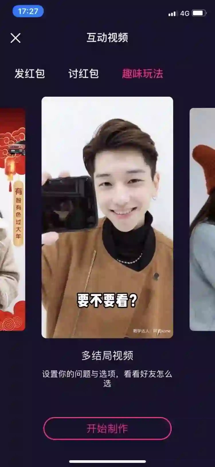 模板包括“手势红包雨”、“多结局埋红包”等多种模板。其中“手势红包雨”会在拍摄者张开手掌时,AI识别并下起红包雨。而“多结局埋红包”中,用户可在视频中插入多个结局并设置红包。