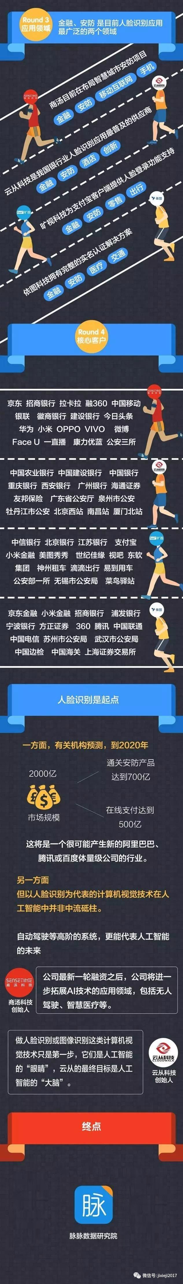 有关机构预测,到2020年,人脸识别的市场规模预计达到2000亿,其中通关安防产品达到700亿,在线支付达到500亿,这将是一个很可能产生新的阿里巴巴、腾讯或百度体量级公司的行业。