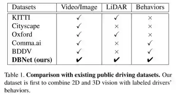 研究介绍说,目前主要的无人驾驶学术研究数据集(如 KITTI [1,2]、Cityscape [3]、BDD100K [4])大多是为研究无人驾驶环境感知如道路、行人、路牌的分类识别而设置的,而 DBNet 是专为研究驾驶行为的策略学习而设置的。DBNet 数据集记录了视频、激光雷达点云,以及对应的资深驾驶员(驾龄超过 10 年)的真实驾驶行为。DBNet 和当前主要无人驾驶学术数据集比较如下: