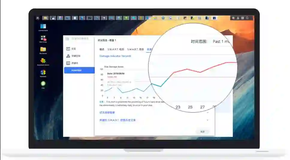 在系统的使用界面中,会显示每颗硬盘分別的损坏预测记录图,借由读取到的硬盘资料每天产生出一个损坏可能值,用戶能将损坏可能值和图中的临界线一并查看,从而推断是否需要更换硬盘。如果损坏情况超过规定临界线,则代表此硬盘在近期內有大概率可能损坏。经过群晖內部技术专家的实际测试和验证,一旦预测值超过警戒线,硬盘在近期內会损坏的概率达到了近 90%,这也意味着,由该系统损坏模型分析出來的准确率能高达 90%。