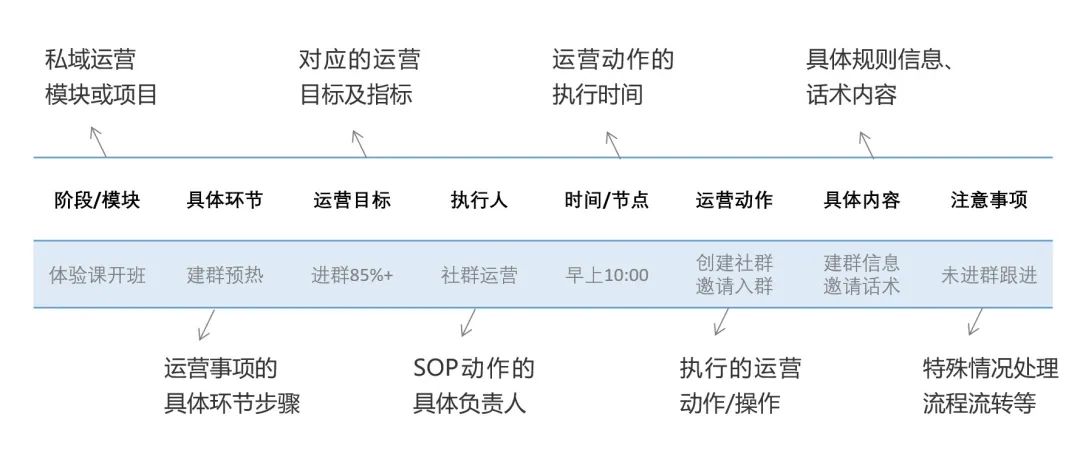 直白来讲,是在私域运营体系的各个模块环节中要进行的成体系的运营动作:什么角色在什么场景什么时间下用什么形式进行什么运营动作以达成什么目标?