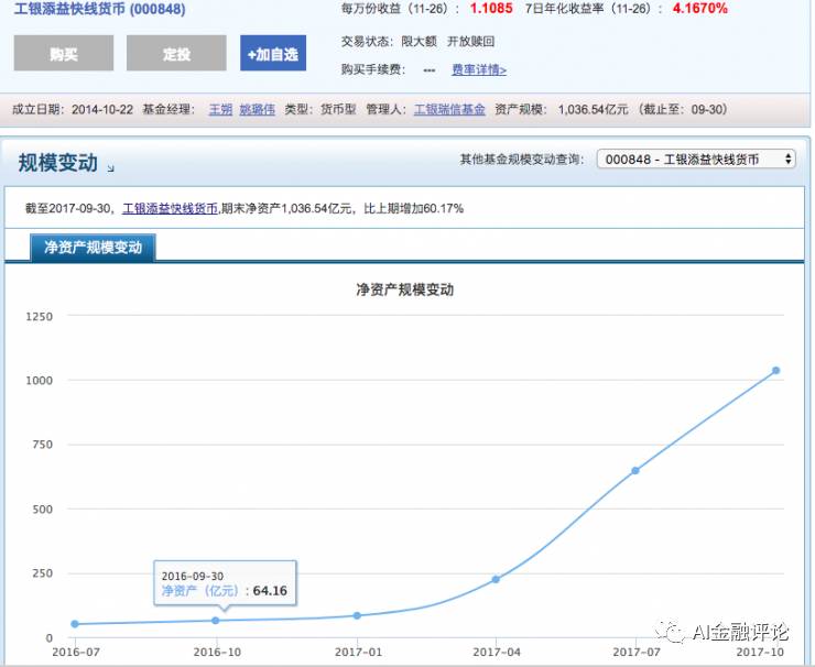 图片数据来源于天天基金。可以看出,添益快线规模一年的时间里,从2016年9月30日的64.16亿元,扩大至1036.54亿元。
