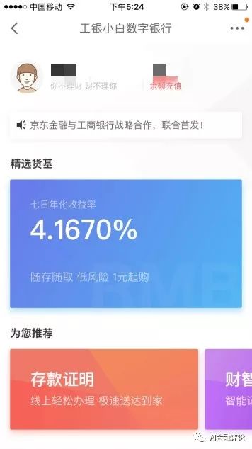 根据雷锋网AI金融评论了解,目前工银小白已在京东金融App上线,中国工商银行手机银行则不久后更新,上线该功能。据观察,工银小白设置在理财栏目。用户只需要上传身份证正反面,然后绑定银行卡账户,就可以成功开通一个工银小白账户,属于工商银行Ⅱ类账户。