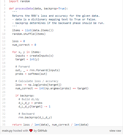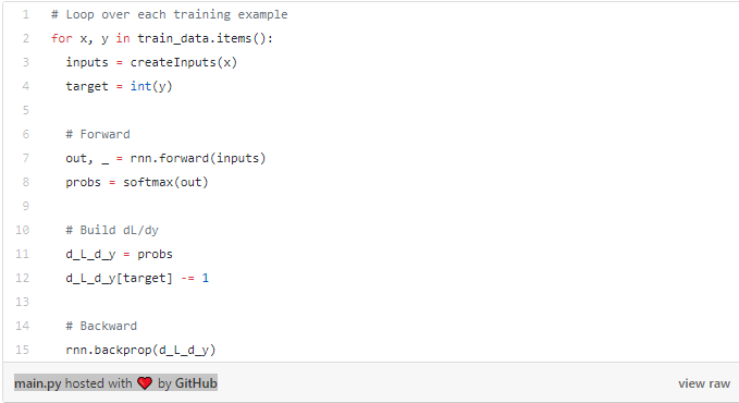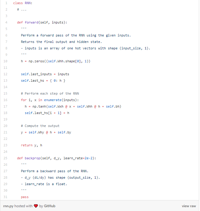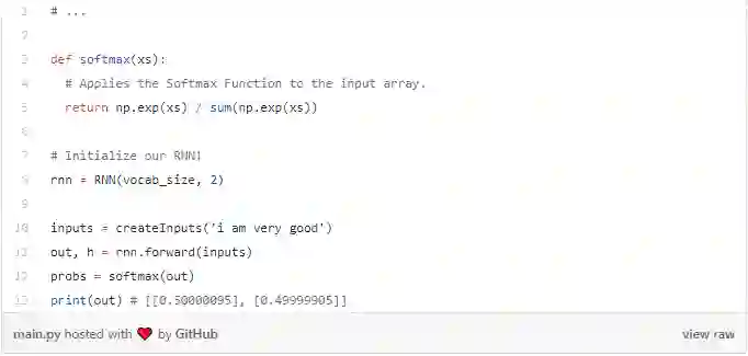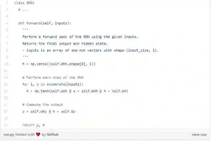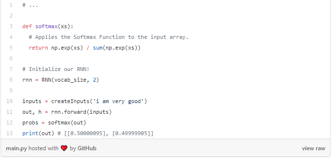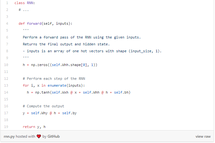 很简单吧! 请注意,我们在第一步中将h初始化为零向量,因为在此之前没有隐藏状态h。我们来试试吧:
