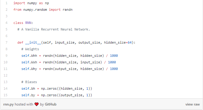 现在是时候开始构建我们的RNN了! 我们首先初始化RNN需要的3个权重和2个偏差: