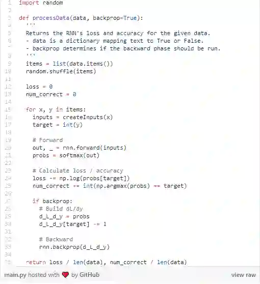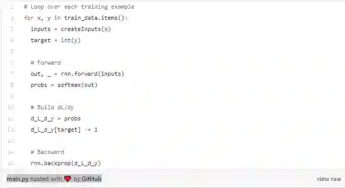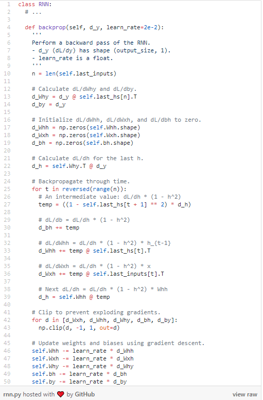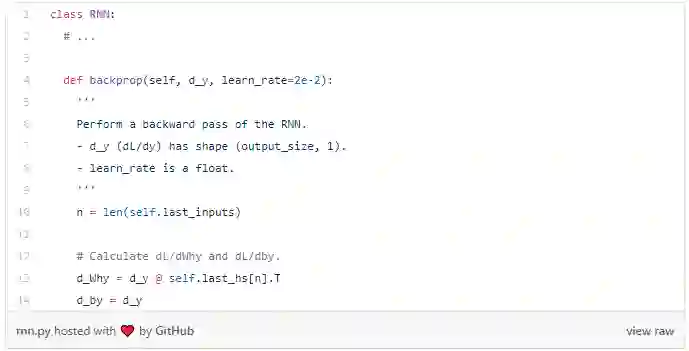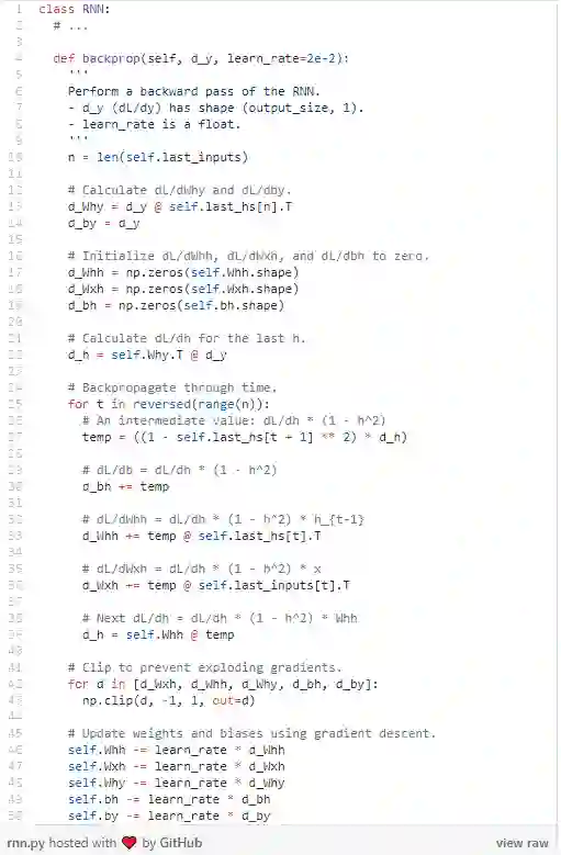 在完成BPTT之后,我们使用np.clip()去除梯度值低于-1或高于1的值.这有助于缓解爆炸梯度问题,即由于具有大量乘法项而使梯度变得非常大。 梯度爆炸或消失对于传统RNN来说是相当成问题的 ,像LSTM这样的更复杂的RNN通常能够更好地处理它们。