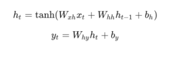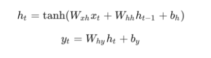 接下来,让我们实现我们的RNN前向传播。 还记得我们之前看到的这两个方程吗?