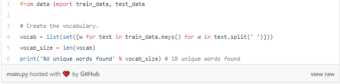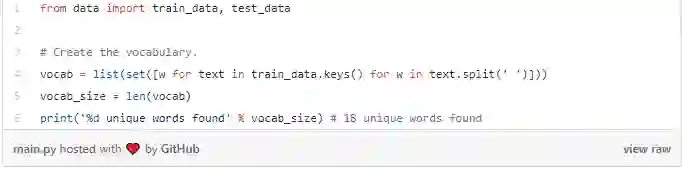 我们必须进行一些预处理才能将数据转换为可用的格式。 首先,我们将构建我们数据中所有单词的词汇表: