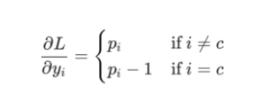 例如,如果我们有p = [0.2,0.2,0.6]并且正确的类是c = 0,那么我们得到∂L/∂y= [ - 0.8,0.2,0.6]。 这也很容易变成代码:
