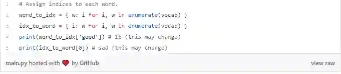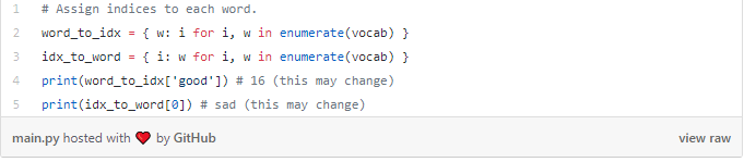我们现在可以用相应的整数索引表示任何给定的单词! 这是必要的,因为RNN无法理解单词 ,我们必须给它们数字。