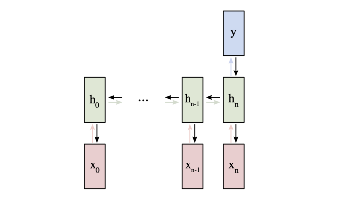 由于这是一个分类问题,我们将使用“多对一”RNN。 这类似于我们之前讨论过的“多对多”RNN,但它只使用最终隐藏状态来生成一个输出y: