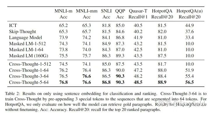 本文提出了Cross-Thought,一种创新的训练句子表示的自监督任务,使得模型利用上下文句子的表示用来恢复当前句子中被mask的token。实验结果显示Cross-Thought在短序列上预训练的有效性,进一步在下游任务上finetune的结果显示超出了许多baseline。