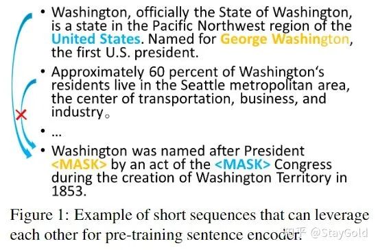Inverse Cloze Task要求给定句子,预测其上下文的句子(类似NSP任务),如上图(b);如之前工作证明的那样,该预训练任务较弱,往往难以学到非常细粒度的、带有充分语义信息的句子表示。