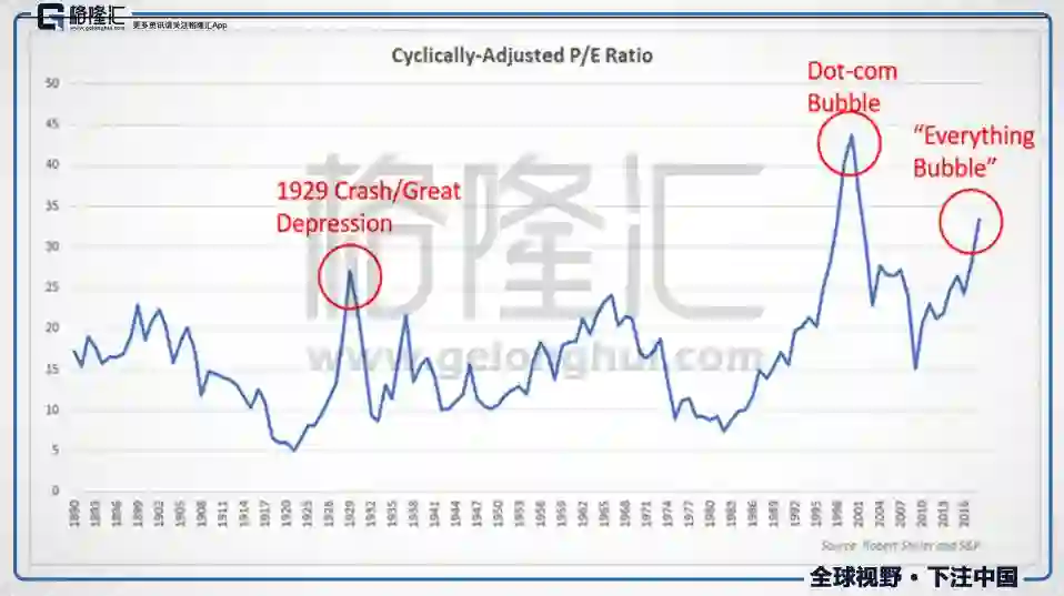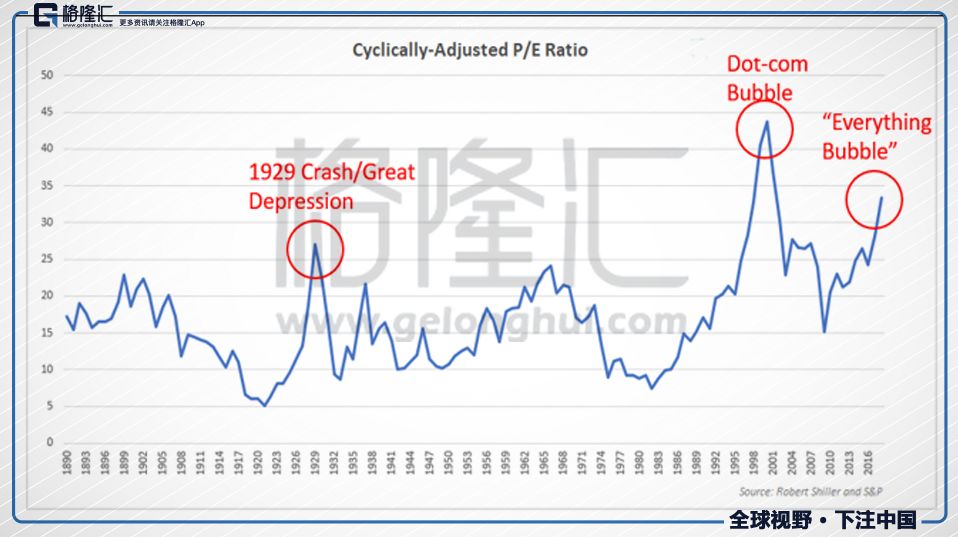 3、从市场估值角度来看,美股的“席勒估值指标”已经达到高位。席勒估值指标(Shiller P/E),又称CAPE Ratio(Cyclically Adjusted Price Earnings Ratio),该指标由诺贝尔经济学家罗伯特·席勒创建(即《非理性繁荣》的作者),其在计算市盈率时加入周期调整的方法,对盈利采用了10年的移动平均。一般而言,席勒估值指标如果处于高位,说明股市已被整体高估甚至处于“非理性繁荣”状态。从图上可以看到,当前的Shiller P/E已经超过1929年的高位,这是一个不好的信号:这预示着美国股市已存在被整体高估的风险。