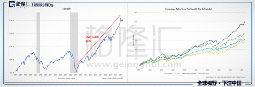 然而,美股依然在若无其事的持续上涨,美联储也在若无其事的加息。2018年8月29日,标普500指数创历史新高。此轮美股牛市从2009年3月9日开始,至今标普500已经大幅上涨逾3倍,被誉为美股史上的最长牛市。综合考虑特朗普的减税政策,以及预示美国经济复苏的宏观数据,叠加新兴市场经济风险产生的美元回流,一切似乎理所应当:美股牛市不该有悬念,甚至当谈论美股泡沫的话题时,“美国经济强劲复苏”成为美股牛市持续的最佳佐证。