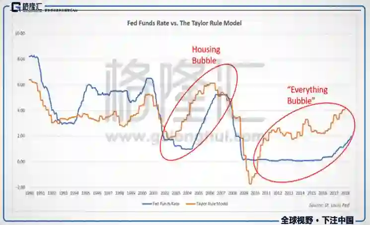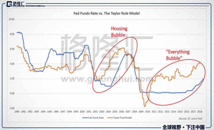 实际上,美联储的宽松早已矫枉过正。我们通过将联邦基金利率与泰勒规则利率做比较来判定美国货币政策是否过度宽松:泰勒规则由经济学家约翰泰勒创建,用以估计中央银行调控联邦基金利率的理想水平。当联邦基金利率比泰勒规则计算的要低很多,意味着利率相对经济增长及通胀已经太低,那么这将增加经济泡沫形成的可能性。根据研究发现,联邦基金利率在2002-2006年房地产泡沫时期,以及当前都要远低于根据泰勒规则计算的利率。
