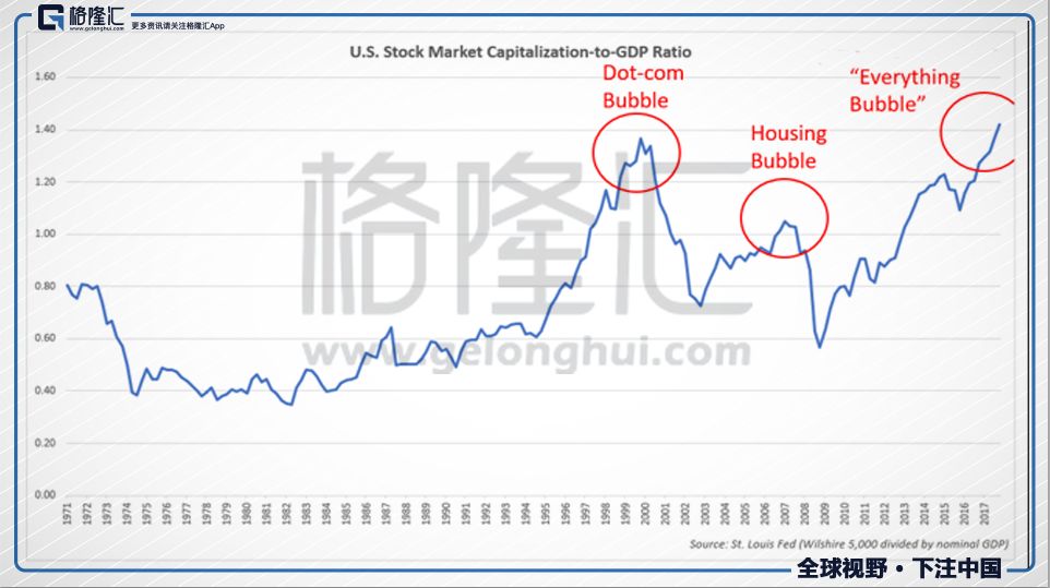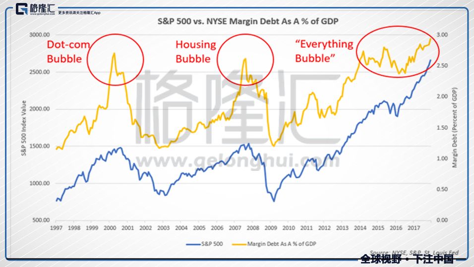 1、美联储低利率政策为资产泡沫创造了条件。自从2008年金融危机爆发,美联储实现量化宽松货币政策人为压低了利率水平,而低利率为资产和信贷泡沫创造了条件:投资者可以以低利率进行融资进行资产投机;低利率促使资金更倾向于进行风险资产投机而不是存银行;公司和政府均可进行低利率融资--美国的经济繁荣便是建立在低成本的信贷大厦之上。这种操作手法其实并不是新鲜事:在格林斯潘主导的低利率时代,联邦基金利率在2000年之后不断下跌,在2002-2006年达到阶段性低位,这一时期的低利率吹起了美国房地产泡沫,直至2007年泡沫破灭引发次贷危机。这一次,联邦基金利率再次走在阶段性低位,次贷危机过去已逾10年,人们心中或许依然有上一次危机的阴影,但他们或许忘记了低利率除了可以催生房地产泡沫,还可以吹大其他资产泡沫。