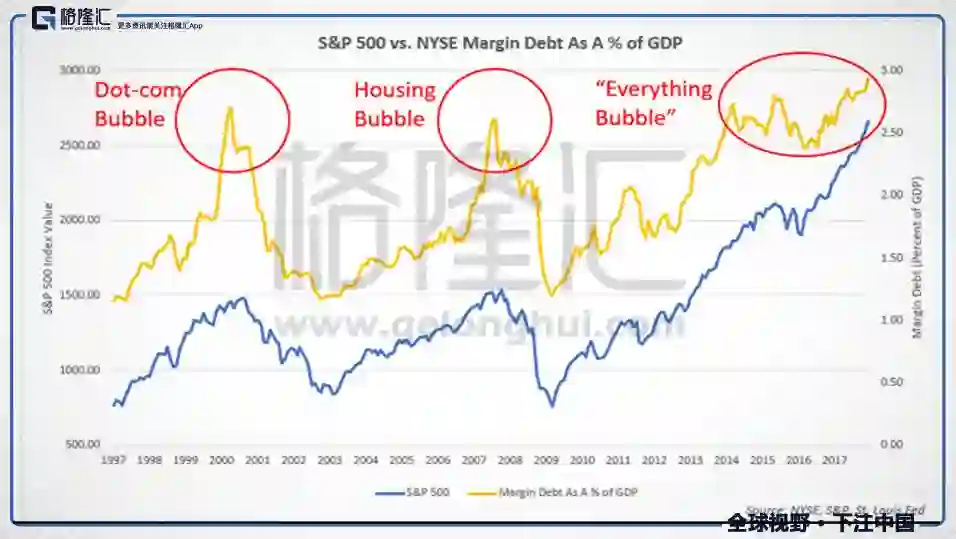 正如每一次股市泡沫的催生与幻灭,不管是2000年的互联网泡沫还是2007年的次贷危机,历史的教训总是无法使泡沫中欢欣鼓舞的参与者形成理性谨慎的判断。自次贷危机后,美联储、欧央行、日央行的资产负债表总和已大幅增长,由2008年的4万亿美元跃升至2018年的15万亿美元,增长逾3倍,与标普500的增长惊人吻合,这其实透露了此次美股牛市的锻造机理。历史已经给予了很多教训,但市场的高涨情绪似乎依然坚信“这次一定不同”,那么美股的这一次牛市真的可以脱离经济发展的规律无休止地攀升吗?美股是否再一次在歌舞升平中吹响泡沫的乐章?