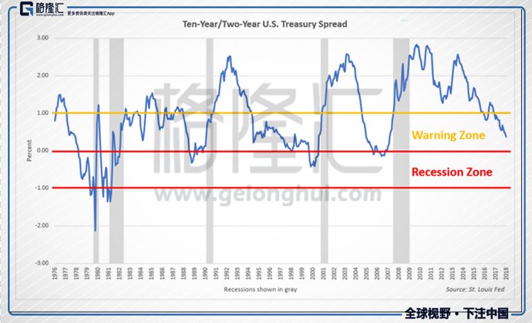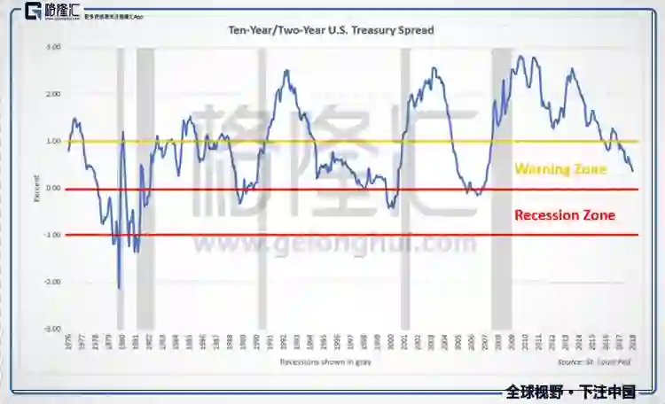 用期限利差观测经济周期的临界变化。一个观测工具是10年期-2年期美国国债的期限利差,该指标也被称为“衰退预警信号”。据Jesse Colombo研究,当10年期/2年期美国国债的期限利差处于0-1%,为衰退预警区,这意味着经济周期已处于成熟期,一场衰退可能在几年内就会出现。当该值处于负区域,收益率曲线倒挂,意味着一次衰退可能在明后年即将来临。在过去半个世纪美国发生衰退之前,收益率曲线都出现倒挂,这也是为什么需要密切关注期限利差的原因。