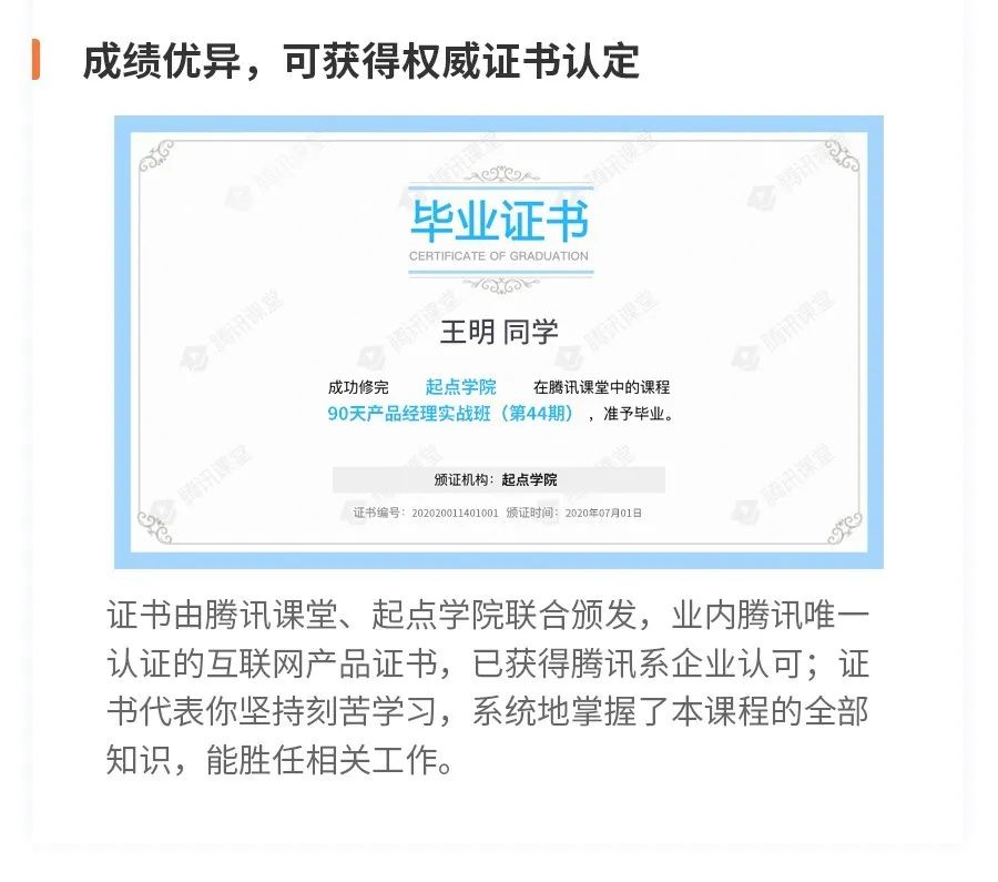 行业认证证书:成绩优异的学员,还将获得业内腾讯唯一认证的互联网产品证书,这意味着获得腾讯系企业认可,含金量满满!