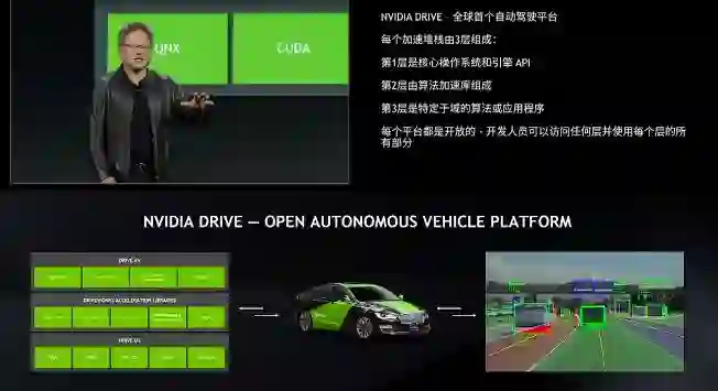 在自动驾驶方面,黄仁勋又介绍了一遍全球首个自动驾驶平台——NVDIA DRIVE 的详细情况。它的每个加速堆栈由 3 层组成,第一层是核心操作系统和引擎 API,第二层是算法加速器,第三层是特定于域的算法或应用程序。重要的是,每个平台都是开放的,开发人员可以访问并使用任何层。