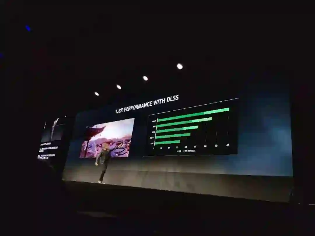 黄仁勋补充说,通过 DLSS 可以实现 1.8 倍的性能,从下图可以看到清晰的对比,浅绿色的部分是使用了 DLSS 之后,GPU 提升的性能: