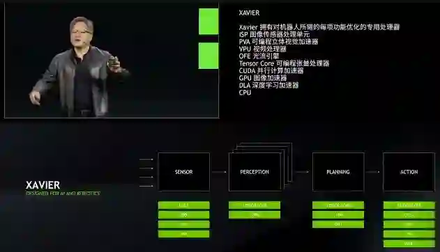 会上,黄仁勋演示了英伟达在 AI 自动化方面的应用。首先是去年发布的“新核弹”自主机器处理器 XAVIER。XAVIER 是第一个专为处理机器人计算业务流而设计的芯片,可用于机器人各项功能优化,京东、美团、菜鸟的运输机器人采用的,就是英伟达的 JETSON AGX XAVIER。