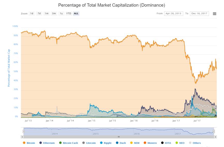 比特币虽然一直突破新高,但是它的市值统治地位一直在下降,从2013年的90%的垄断地位,在今年七月达到低于40%的最低点,而后略有上浮。此次牛市开始,很多竞争币的价值开始被挖掘,而比特币则因为区块容量解决方案僵持不下的问题,导致开发停滞。但是比特币始终是吸引投资者进入这个市场的门面,市场扩大后,价值还是会继续上升,同时比特币也是与竞争币交易的一个重要配对,交易量很大,这对它的地位起了很重要的巩固作用。