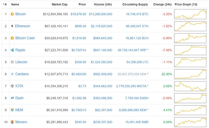 面对比特币的暴涨,对准数字货币的资金大量涌向比特币。然而在分析一种数字货币是否存在超过比特币的投资价值时主要应分析其技术是否有革新,或其相同技术的质量是否超过比特币。但现今市场上的大部分数字货币均为基于比特币算法开发出的类似的数字货币,并无显著差异。并且在各国ICO的限制下,新型数字货币的出现已面临停滞。比特币的这主要竞品现有以太币(市值第二),莱特币(市值第五),详见上图。