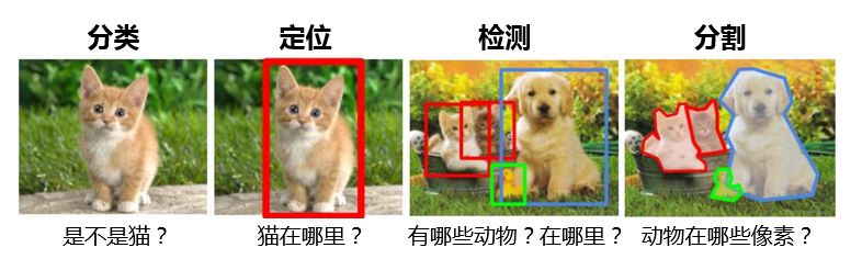 图像识别检测的过程包括图像预处理、图像分割、特征提取和判断匹配,也是基于深度学习的端到端方案。可以用来处理分类问题(如识别图片的内容是不是猫)、定位问题(如识别图片中的猫在哪里)、检测问题(如识别图片中有哪些动物、分别在哪里)、分割问题(如图片中的哪些像素区域是猫)等。
