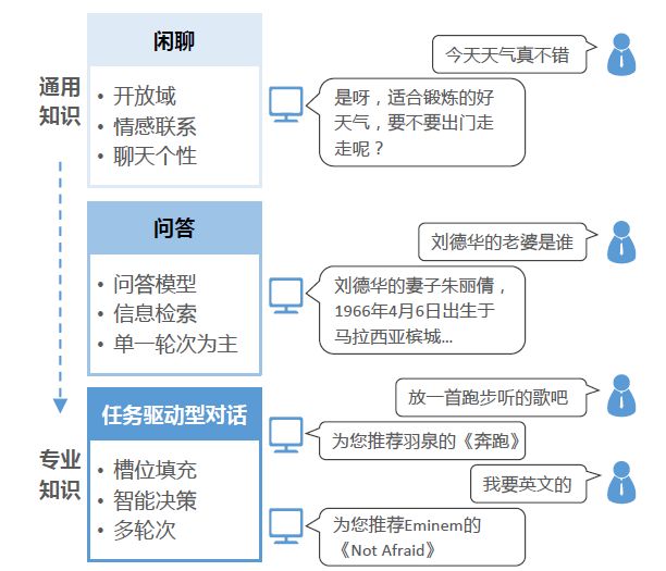 目前对话管理主要包含三种情形,按照涉及知识的通用到专业,依次是闲聊、问答、任务驱动型对话。