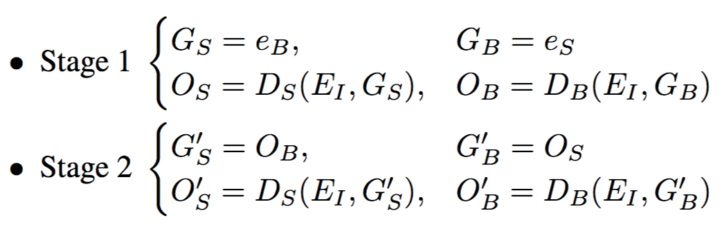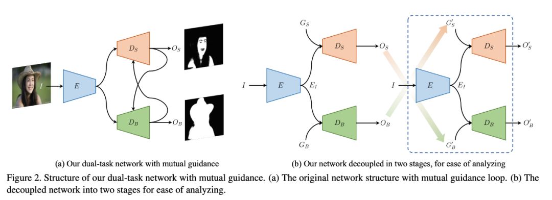 整个网络包含一个共享的编码器,但皮肤检测和身体检测各有一个解码器。一个解码器的输出作为另一个解码器的输入,如此形成一个闭环,如图 2(a)所示。