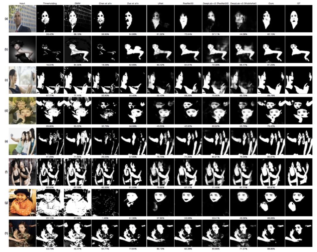 图 5:不同方法在本文验证集上的皮肤检测常见结果