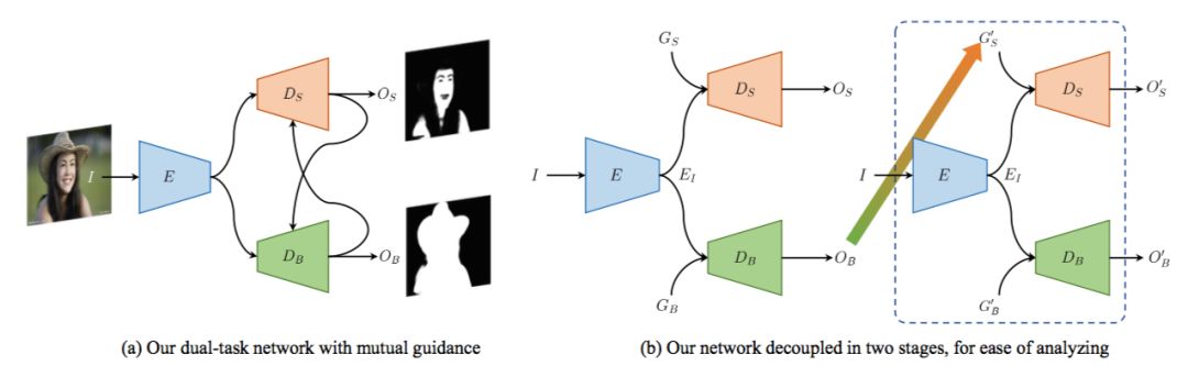 这个双任务网络包含一个编码器,却有两个解码器,分别用于两个任务。这两个解码器以互向导的方式进行工作,即皮肤或身体解码器的输出作为一个向导提升检测性能,反之亦然。
