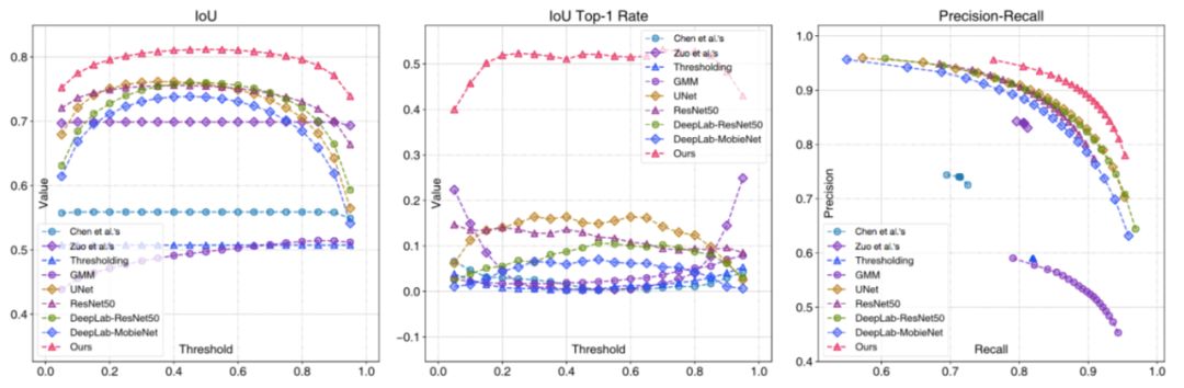 本文同样给出了 IoU、IoU Top-1 rate 和 precision-recall 的曲线,如图 6 所示: