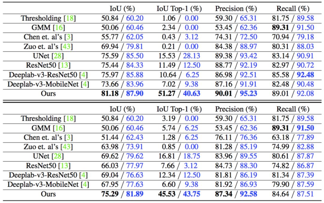 为了进行定量对比,本文评估了所有结果的 precision、recall 和 IoU,并与四个 CNN 方法在公开数据集 Pratheepan Face 上做了对比,结果如表 1 所示。
