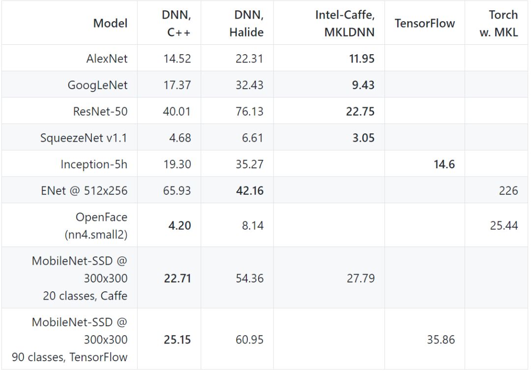 你可以在这里找到最新的基准结果:https://github.com/opencv/opencv/wiki/DNN-Efficiency