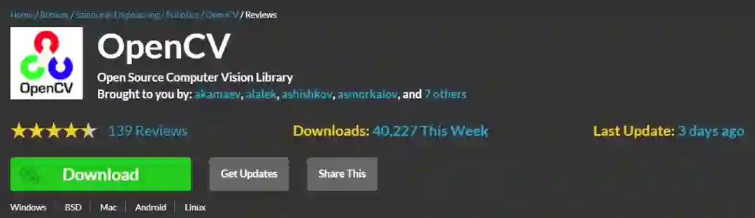 此外,在 OpenCL 的加持下,OpenCV 可以利用底层异构计算平台的硬件加速。它的 GitHub 页面中有一个「open_model_zoo」资源库,包含了大量的计算机视觉预训练模型,并提供下载方法,有助于加速开发和产品部署过程。OpenCV 应用广泛,目前在用户社区有 4.7 万用户,下载量约为 1400 万。