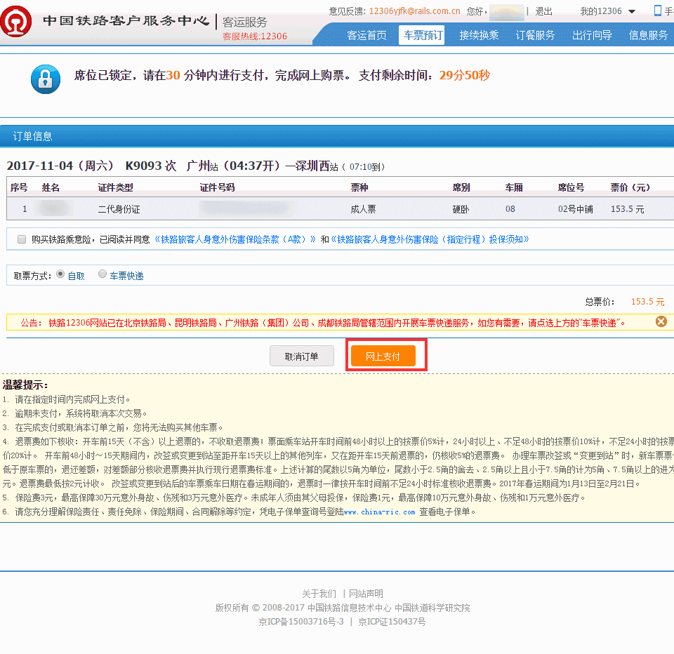 用户在12306官方APP选择出行日期及车次后,即可进入到订单页面;在完成信息核实、订单提交后,点击“立即支付”进入支付页面,此后,便可选择“微信支付”付款购票。在12306官网,用户也能通过微信扫码付款,获得同样的便捷操作。