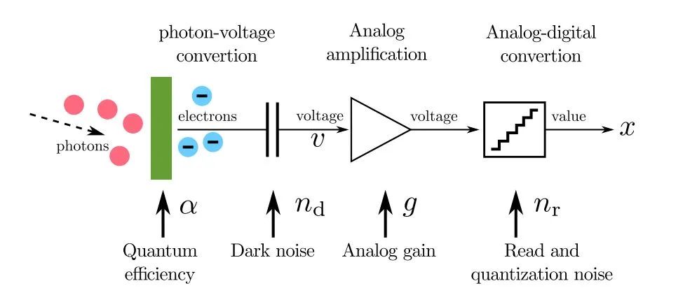 在理想情况下应该如公式(1)所示,预期打到像素区域的光子数量u*,经由转换效率alpha及模拟增益g两重作用之后,得到一个理想的像素强度值x*。然而,由于光子存在着波粒二象性,分布服从公式3,并且转换过程也会存在着噪声的影响,实际的CMOS成像过程为公式2,模拟增益g之前会存在暗电流,分布服从公式4的高斯分布,模拟增益之后的读出噪声分布服从公式5,这里将量化噪声也包含在读出噪声之中了。