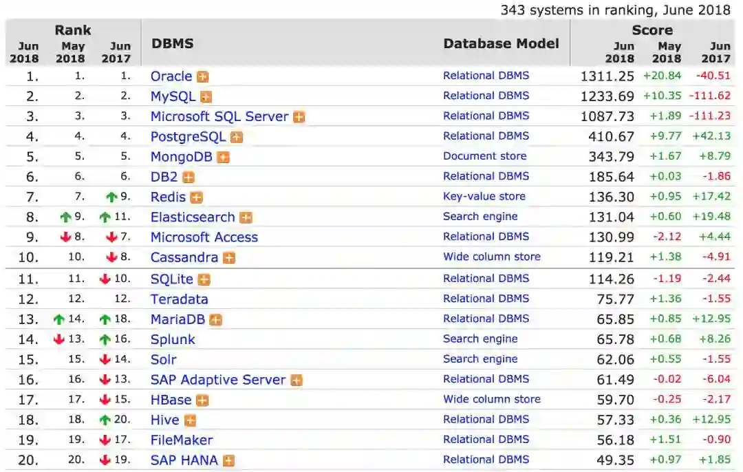 DB-Engines 刚刚发布了 2018 年 6 月份的数据库排名,排名前三的依然是 Oracle、MySQL 和 Microsoft SQL Server 。前 20 名的数据库中,本月排名出现上升的有 Elasticsearch 和 MariaDB ,分别从第 9 上升到第 8 和 第14 位升至第 13 位。此外,前 20 名的数据库中,本月涨幅最高的分别为:Oracle、MySQL 和 postgreSQL 。