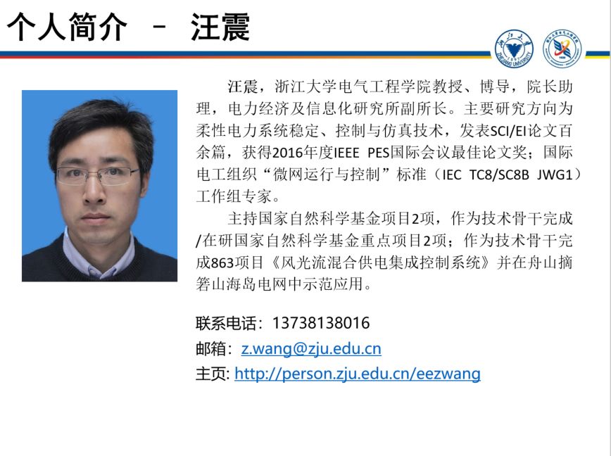 汪震,浙江大学电气工程学院教授、博导,院长助理,电力经济及信息化研究所副所长。主要研究方向为柔性电力系统稳定、控制与仿真技术,发表SCI/EI论文百余篇,获得2016年度IEEE PES国际会议最佳论文奖;国际电工组织“微网运行与控制”标准(IEC TC8/SC8B JWG1)工作组专家。主持国家自然科学基金项目2项,作为技术骨干完成/在研国家自然科学基金重点项目2项;作为技术骨干完成863项目《风光流混合供电集成控制系统》并在舟山摘箬山海岛电网中示范应用。