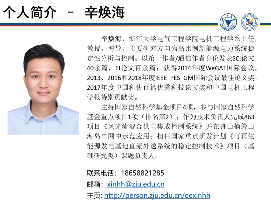 辛焕海,1981年3月生,江西萍乡人,电气学院电机工程学系主任,教授,博导,主要研究方向为高比例新能源电力系统稳定性分析与控制。2007年获浙江大学电力系统及其自动化博士学位,入选浙江大学“求是青年学者”、浙江省151第三层次人才等人才计划。以第一作者/通信作者身份发表SCI论文40余篇,EI论文百余篇,论文被引用千余次;获得2014年度WeGAT国际会议以及2013、2016和2018年度IEEE PES国际会议最佳论文奖,中国科协百篇优秀科技论文奖,中国电机工程学报特别贡献奖。主持国家自然科学基金项目4项,参与国家自然科学基金重点项目1项(排名第2);作为技术负责人完成863项目《风光流混合供电集成控制系统》并在舟山市摘箬山海岛电网中示范应用;担任2017年国家重点研发计划《可再生能源发电基地直流外送系统的稳定控制技术》项目(基础研究类)的课题负责人。