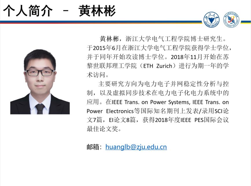 黄林彬,浙江大学电气工程学院博士研究生。于2015年6月在浙江大学电气工程学院获得学士学位,并于同年开始攻读博士学位。2018年11月开始在苏黎世联邦理工学院(ETH Zurich)进行为期一年的学术访问。主要研究方向为电力电子并网稳定性分析与控制,以及虚拟同步技术在电力电子化电力系统中的应用。在IEEE Trans. on Power Systems, IEEE Trans. on Power Electronics等国际知名期刊上发表/录用SCI论文7篇,EI论文8篇,获得2018年度IEEE PES国际会议最佳论文奖。