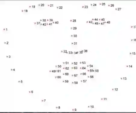 这张图通过 68 个点描述了人脸的轮廓,这 68 个点 就是关键点,也有 5 个点的关键点和其他的规格。
