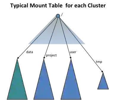 View文件系统具有多个集群的Hadoop系统的上下文中显示,每个集群可以联合到多个命名空间中,以提供每个群集的全局命名空间,以便应用程序可以以类似于联合前的方式运行。