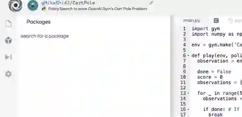 安装这个项目所需的两个软件包:numpy 用于帮助数值计算,而 OpenAI Gym 则作为智能体的模拟器。如下图所示,只需在编辑器左侧的包搜索工具中输入 gym 和 numpy,然后单击加号按钮即可安装这两个包。